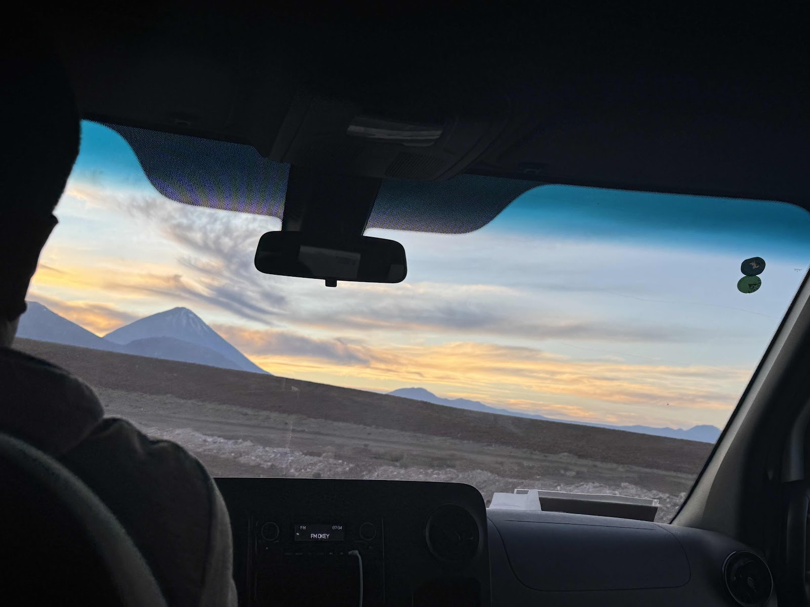 Kevin decided to stay in bed, so Jemima and I nabbed the front seats in a full van - 9 of us and two guides, watching the sun rise over the desert as we drove up into the Altiplano. We were glad of our layers - it was 5 degrees outside.
